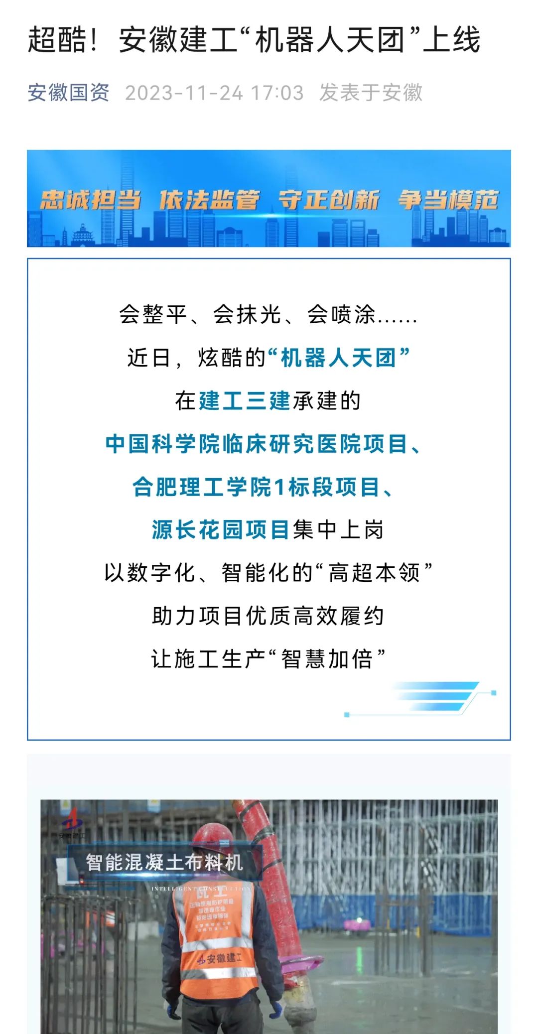 11月23日,中新網、安徽國資、合肥晚報以“建筑工地迎‘機器人天團’安徽建工三建集團開啟智能建造新篇章”為題,專題報道公司首批引進五臺建筑機器人助力項目高質量建設,開啟智能建造新篇章,受到廣泛關注。截至發稿時,閱讀量已超20萬次。